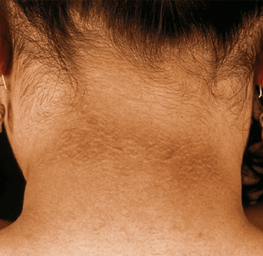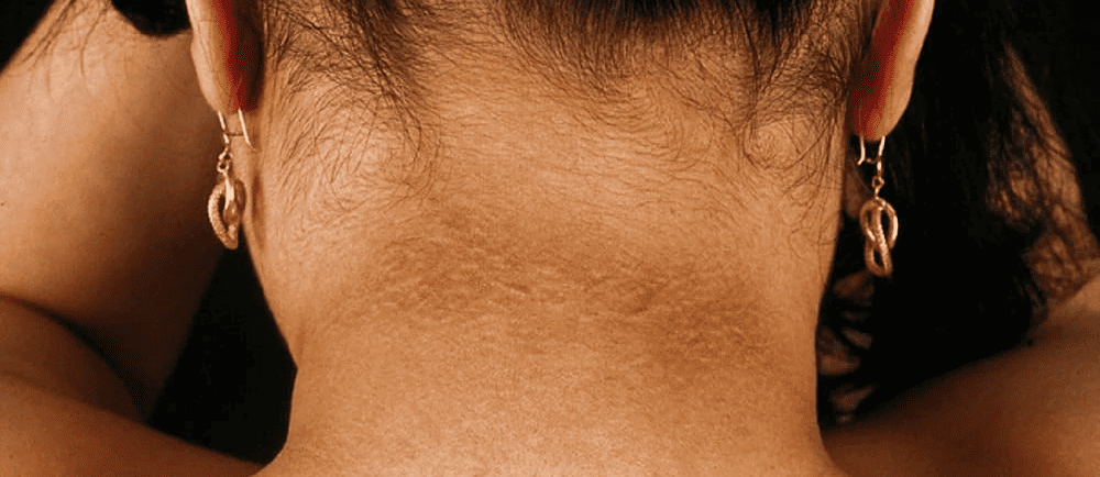 Escurecimento da pele em regiões como pescoço e axilas (acantose nigricans)
